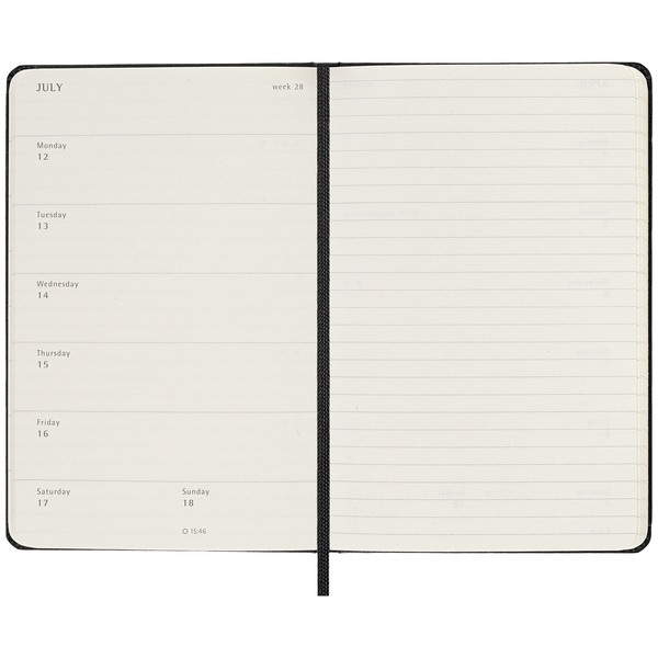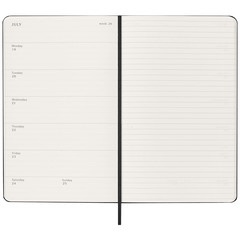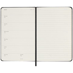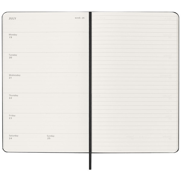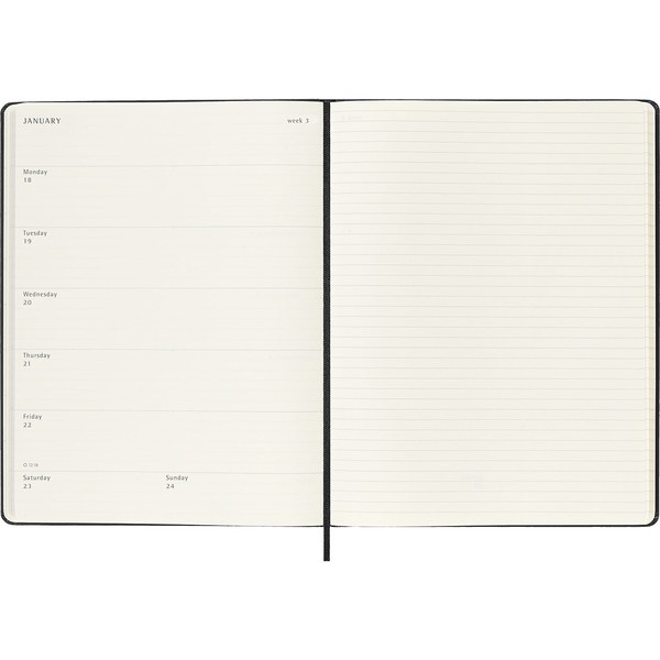 Esta agenda/diario semanal de 18 meses abarca de julio a diciembre. Muestra las citas de la semana a la izquierda, y una página pautada para plasmar notas e ideas a la derecha con toda la libertad que te brindaría un diario.