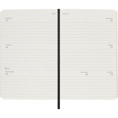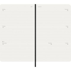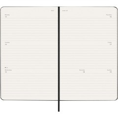 Esta agenda semanal apaisada de Moleskine abarca de enero a diciembre. Su formato apaisado permite mostrar cada semana en un desplegable a doble página (lunes, martes y miércoles a la izquierda; y jueves, viernes y sábado/domingo a la derecha), por lo que resulta perfecta para conocer de un vistazo las actividades de toda la semana.