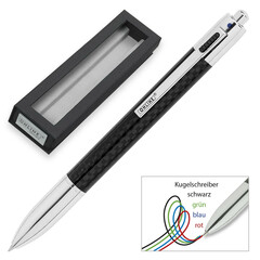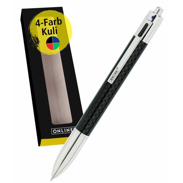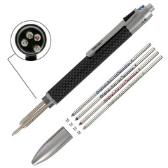 4 colores de escritura en un solo bolígrafo (azul, negro, rojo, verde). El color se puede cambiar a la velocidad del rayo según sea necesario. El juego también incluye 4 recambios de bolígrafo. Los recambios se pueden cambiar rápida y fácilmente en cualquier momento. El ancho medio M corresponde a los estándares internacionales. Su carcasa de metal de alta calidad y su bola de acero inoxidable completan las mini recargas.