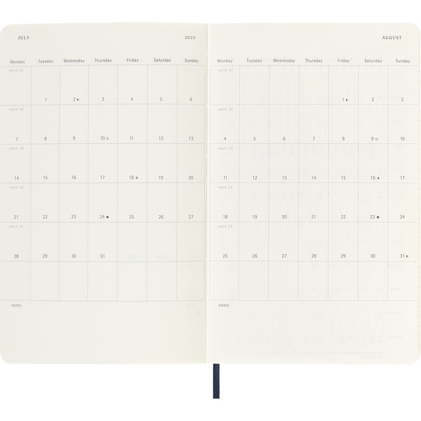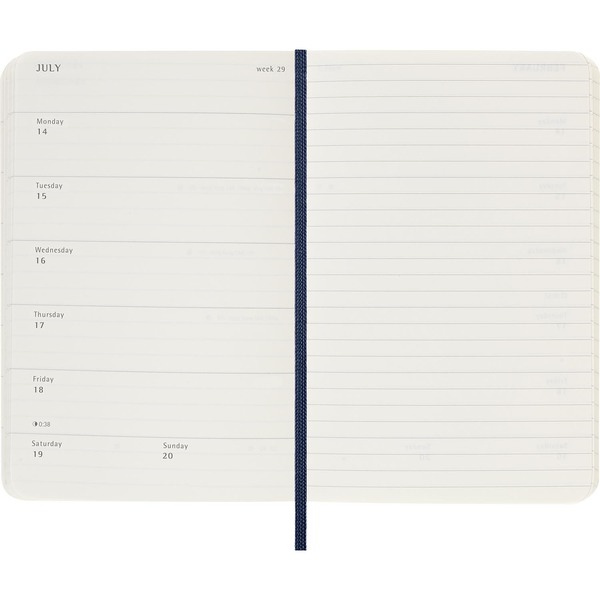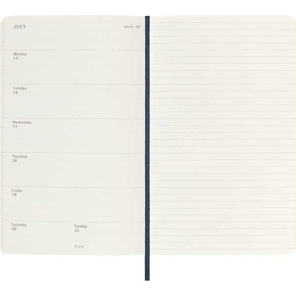 Esta agenda/diario semanal de 18 meses abarca de julio a diciembre. Muestra las citas de la semana a la izquierda, y una página pautada para plasmar notas e ideas a la derecha con toda la libertad que te brindaría un diario.