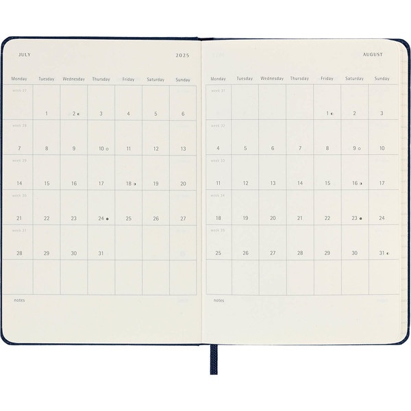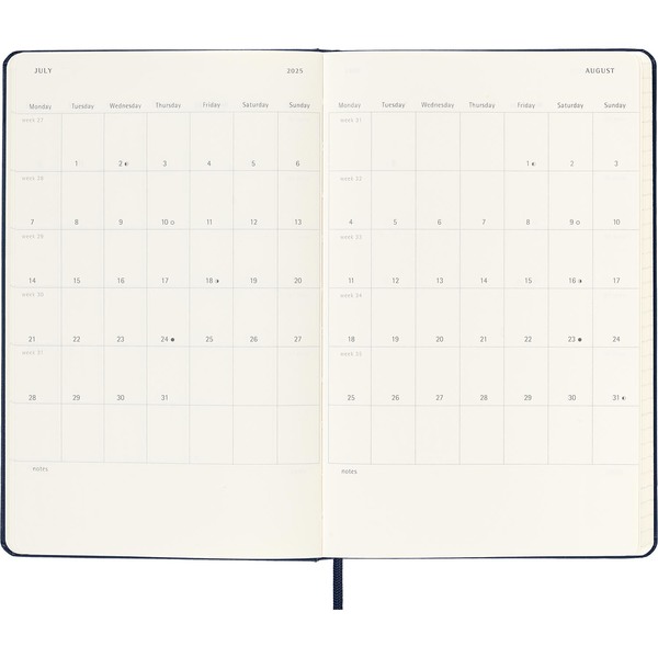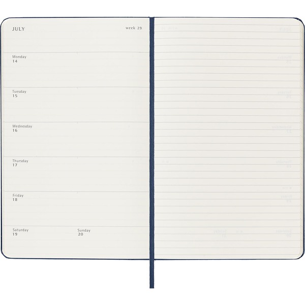 Esta agenda/diario semanal de 18 meses abarca de julio a diciembre. Muestra las citas de la semana a la izquierda, y una página pautada para plasmar notas e ideas a la derecha con toda la libertad que te brindaría un diario.