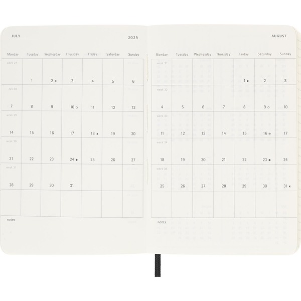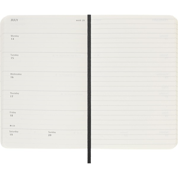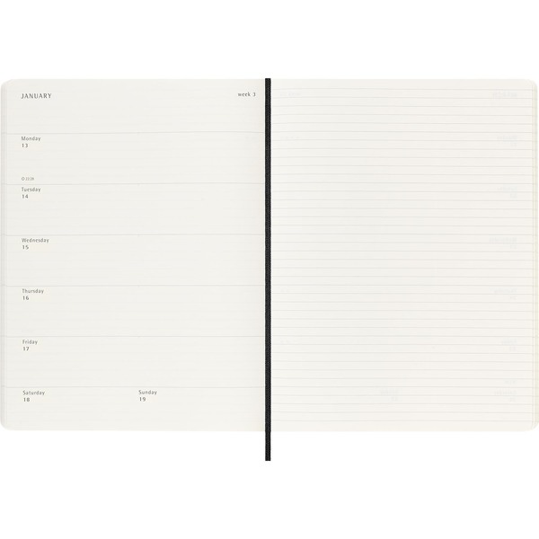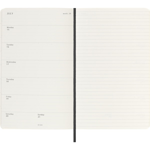 Esta agenda/diario semanal de 18 meses abarca de julio a diciembre. Muestra las citas de la semana a la izquierda, y una página pautada para plasmar notas e ideas a la derecha con toda la libertad que te brindaría un diario.