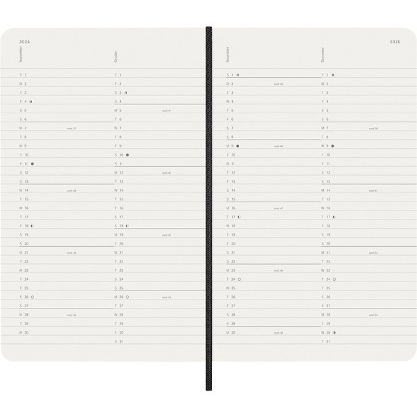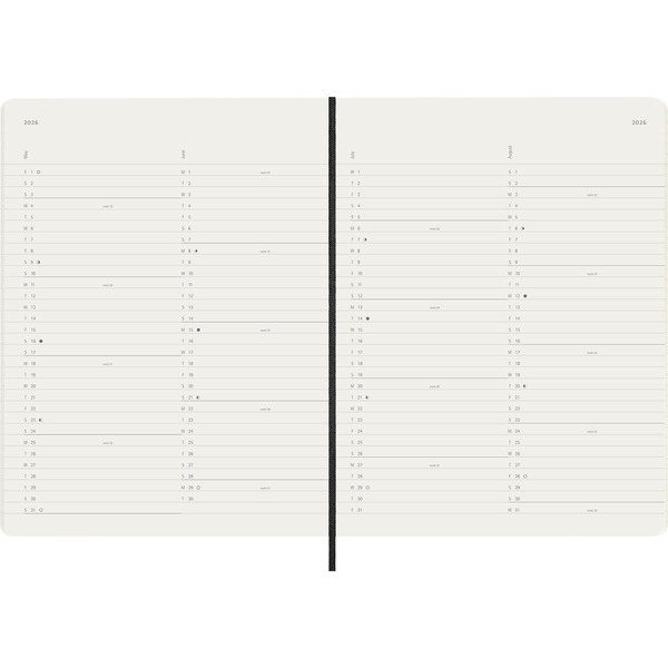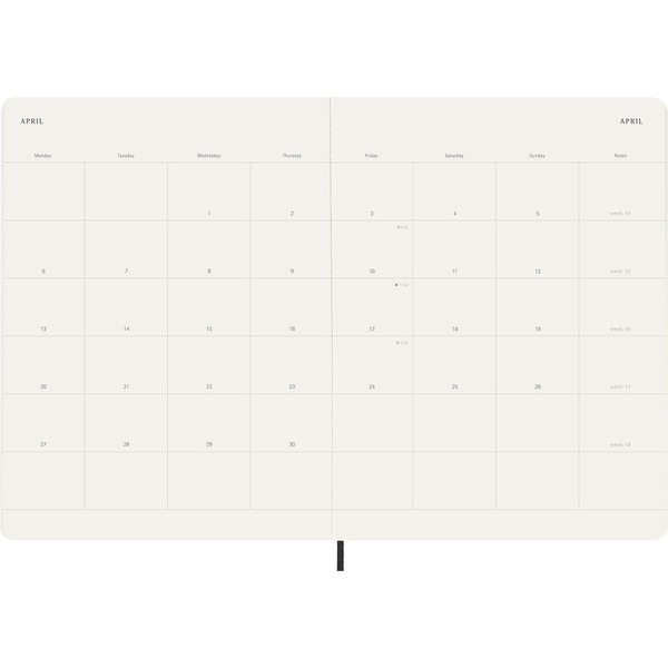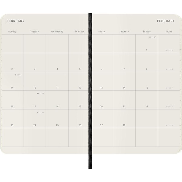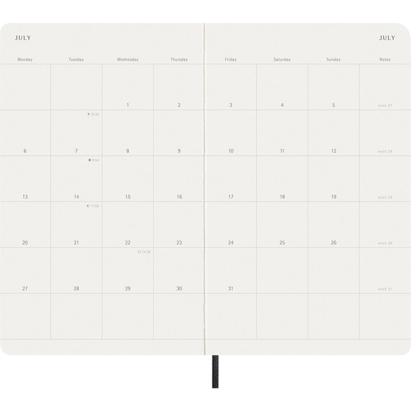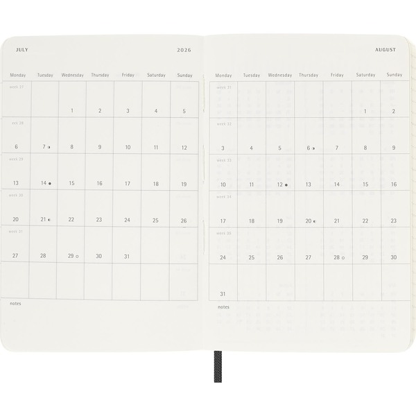 Esta agenda mensual de Moleskine abarca de enero a diciembre. Esta agenda muestra cada mes en un desplegable de dos páginas, seguido de una página de doble pauta, para tomar notas. Al final se incluyen 51 páginas pautadas que ofrecen espacio adicional para organizar y planificar el año. La combinación perfecta de libertad y organización.