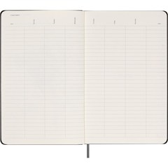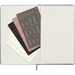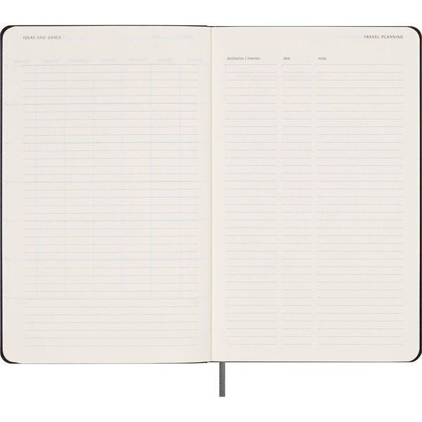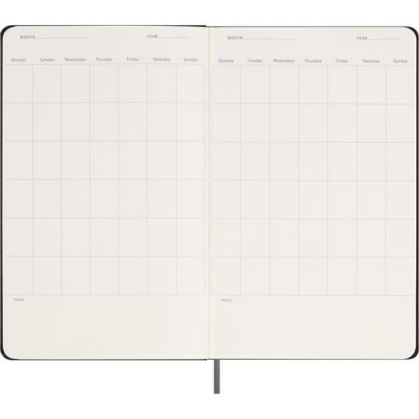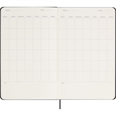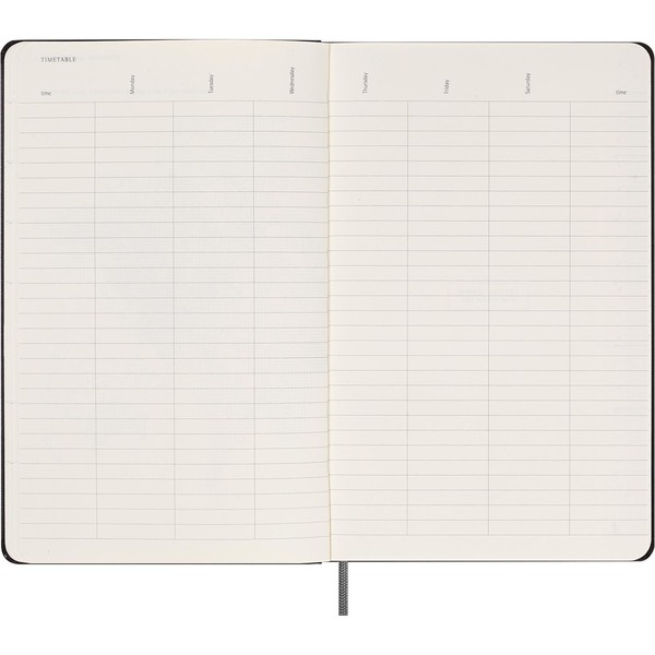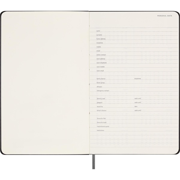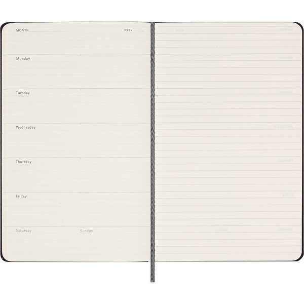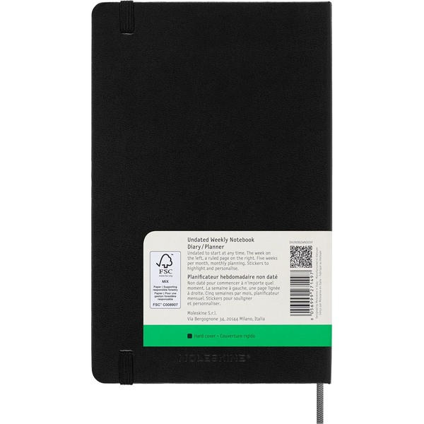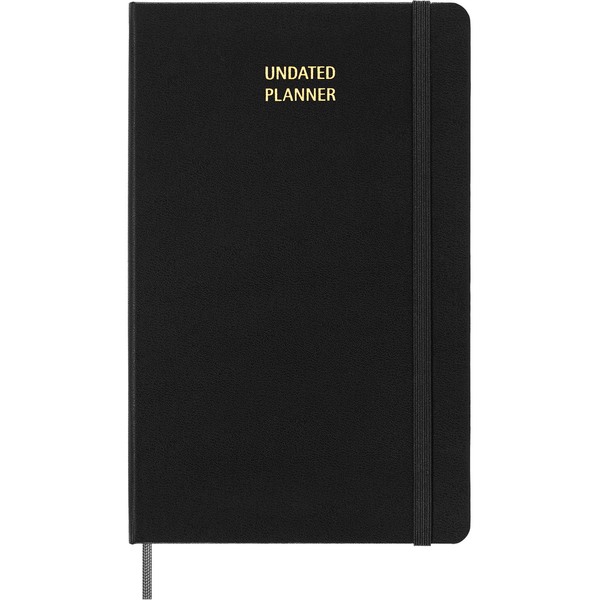 Bienvenido a la versión sin fecha de la Agenda Clásica Moleskine. Sus estructuradas páginas de color marfil contienen todas las características prácticas e inmediatamente reconocibles de una agenda semanal Moleskine, pero sin fechas. Sin fecha para empezar cuando usted elija. Puede empezar esta agenda semanal sin fecha en cualquier momento del año. Hemos dejado los espacios del mes, la semana y la fecha en blanco para que usted los rellene, dándole más versatilidad y libertad que una agenda fechada. Al añadir las fechas tú mismo, puedes saltarte cualquier hueco y simplemente hacer uso de las páginas que realmente necesites. Sin fecha te permite planificar tu vida: no tienes que esperar a que empiece el año. Puedes adaptarla al curso escolar o a tus necesidades personales o laborales. Hay doce meses sin nombre, cada uno con cinco semanas sin fecha para que los utilices como quieras. Cuaderno y agenda juntos. Esta práctica estructura ofrece dos páginas para cada semana: los días de la semana se muestran horizontalmente en la página izquierda, frente a una página rayada para notas, tareas y pensamientos. Este útil diseño combina cuaderno y agenda, para que tengas lo mejor de ambos mundos: suficiente estructura para mantenerte organizado y suficiente espacio para pensar y crear. Contenido para potenciar su planificación. La Agenda Undated Classic incluye un juego de pegatinas especiales. Hay adhesivos mensuales para personalizar cada uno de los 12 separadores y adhesivos anuales para el lomo. También hay mini calendarios mensuales para completar con fechas y aplicar a los separadores de los meses. Las páginas introductorias de esta agenda muestran una visión general de cuatro años para la planificación a largo plazo, un calendario semanal y espacio para planificar viajes, ideas y objetivos.
