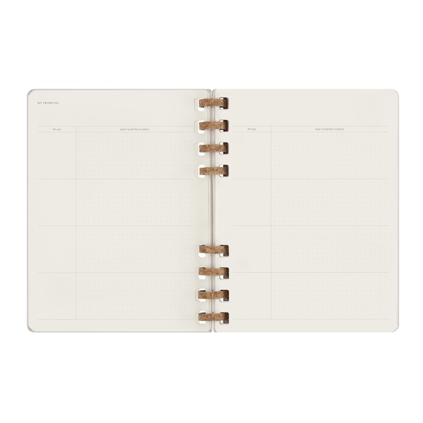 Te presentamos la Agenda Life Undated, una agenda completa con todo lo que necesitas para organizarte sin dejar de dedicar tiempo al bienestar y la creatividad cada día. El diseño estructurado sin fecha del interior gira totalmente en torno a los planes, hábitos y objetivos que te importan, mes a mes y semana a semana.