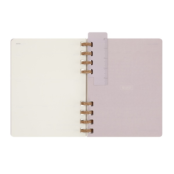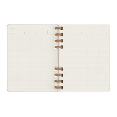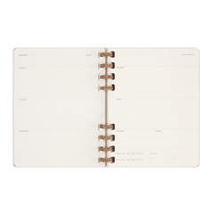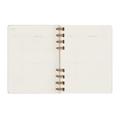 Cada mes de esta agenda comienza con un calendario mensual sin fecha para programar tareas y citas a largo plazo, mientras que las semanas se muestran de un vistazo en dos páginas para tareas pendientes, eventos e ideas más detalladas. Cada sección mensual incluye cinco semanas sin fecha.