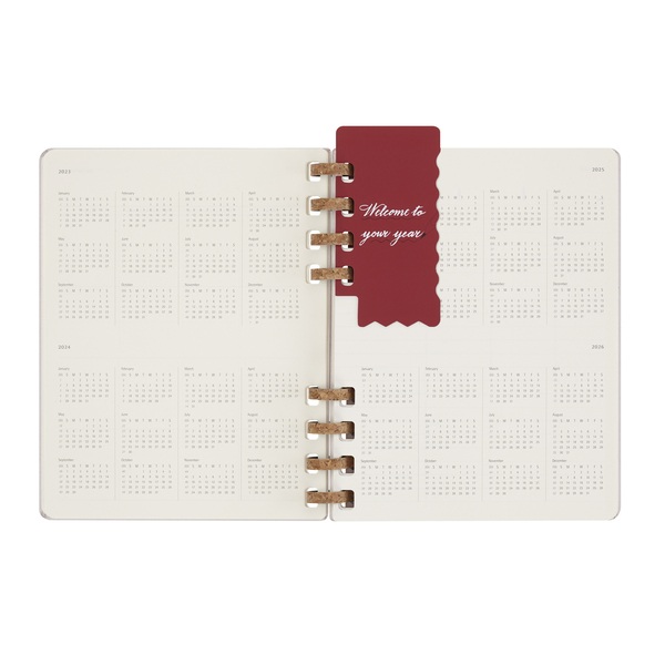 La Agenda Life Undated tiene un conjunto de adhesivos útiles, incluidos adhesivos mensuales para cada sección. Hay dos marcapáginas, incluida una regla, y adhesivos para minicalendarios mensuales para los separadores mensuales. Las páginas introductorias ofrecen una visión general de cuatro años para planificar a largo plazo, un calendario y una sección para planificar viajes y desplazamientos cortos.
