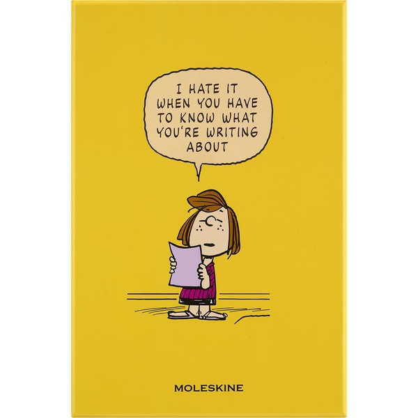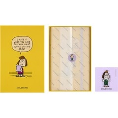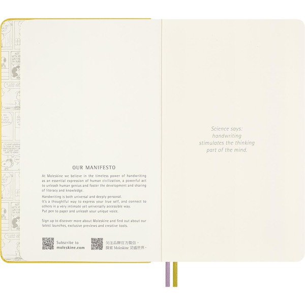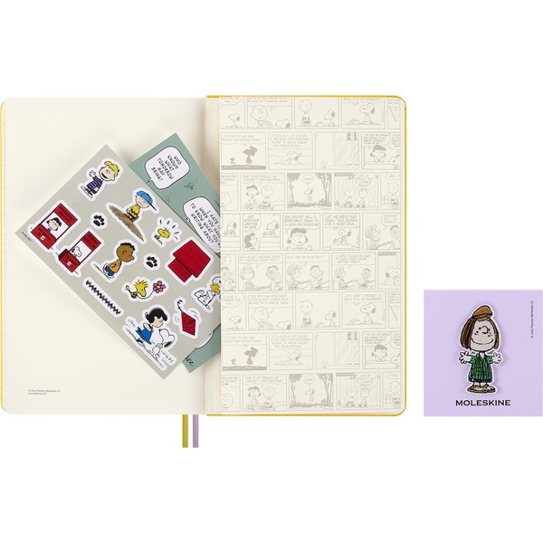 Expresa tus pensamientos, bocetos e ideas con este cuaderno Peanuts x Moleskine, un homenaje a las verdades eternas y a la magia de la escritura manuscritas. Este cuaderno grande y a rayas muestra las queridas ilustraciones de Peanuts y una cita que celebra la alegría de escribir y tomar notas. Combinando creatividad y funcionalidad, incluye pegatinas con la temática de Peanuts, un parche bordado adhesivo, un marcapáginas de papel y guardas a medida. La tapa dura y resistente, el cierre elástico y los dos marcapáginas de cinta mantienen sus notas protegidas y ordenadas. Elaborado con esmero, su papel libre de ácido (100 g/m²) de tono marfil se abre completamente a 180° para escribir sin esfuerzo. Un bolsillo extensible en la parte trasera y el mensaje "En caso de pérdida" contribuyen a su atractivo clásico. En una caja de regalo reutilizable, este cuaderno de Moleskine no sólo encarna el perdurable encanto de Peanuts, sino que también pone de relieve los demostrados beneficios cognitivos de la escritura manuscrita: agudiza el pensamiento y estimula la actividad cerebral. De una historia real a otra, deja que Peanuts y Moleskine despierten tu imaginación. Historias reales. Escribe la tuya.