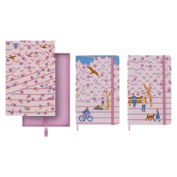 Celebra la temporada de la sakura a través del trabajo del talentoso diseñador textil Yuri Himuro. La sakura ha simbolizado durante mucho tiempo el renacimiento primaveral, así como la naturaleza frágil y transitoria de todas las cosas. La obra tejida de Yuri captura un momento de alegría y reflexión, brindándote espacio para transformar la fugaz inspiración en proyectos y planes duraderos. El motivo de cada portada textil está inspirado en el Parque de Ueno en la temporada de los cerezos en flor, un lugar próximo al corazón de Yuri; cada portada muestra una escena diferente que, colocada una al lado de la otra, muestra el parque en su totalidad. El juego de Sakura en caja incluye un cuaderno liso y otro a rayas junto con un póster que se despliega para mostrar todo el Parque de Ueno interpretado por el artista.