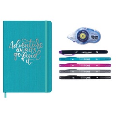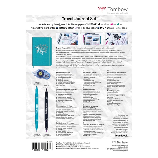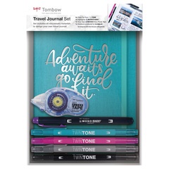 Set que contiene todo el material necesario para diseñar un diario de viaje y grabar experiencias únicas e irrepetibles. Contiene un diario de viaje, rotuladores doble punta de fibra, un rotulador fluorescente doble punta para resaltar eventos especiales, una cinta adhesiva para pegar fotos, entradas, recibos, tickets de viaje, etc...