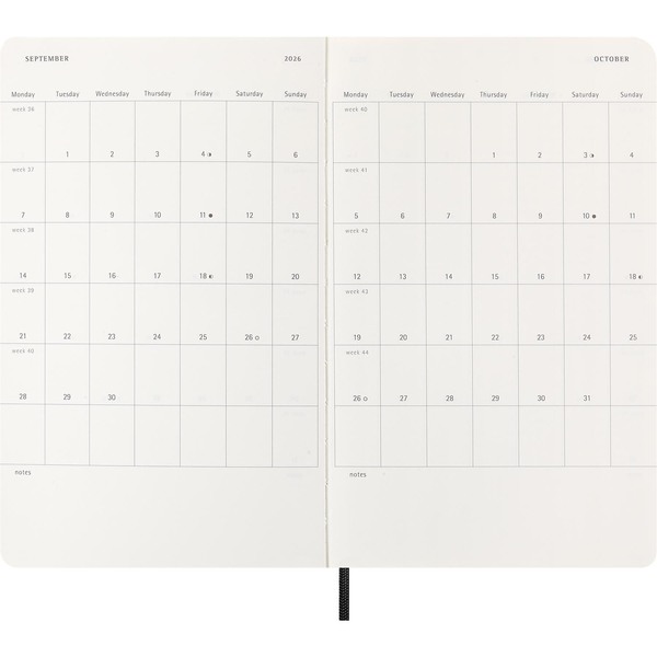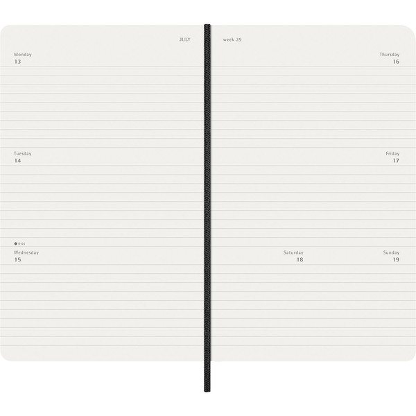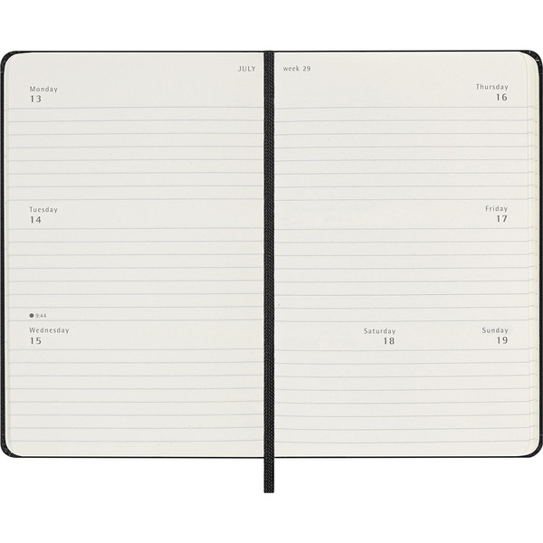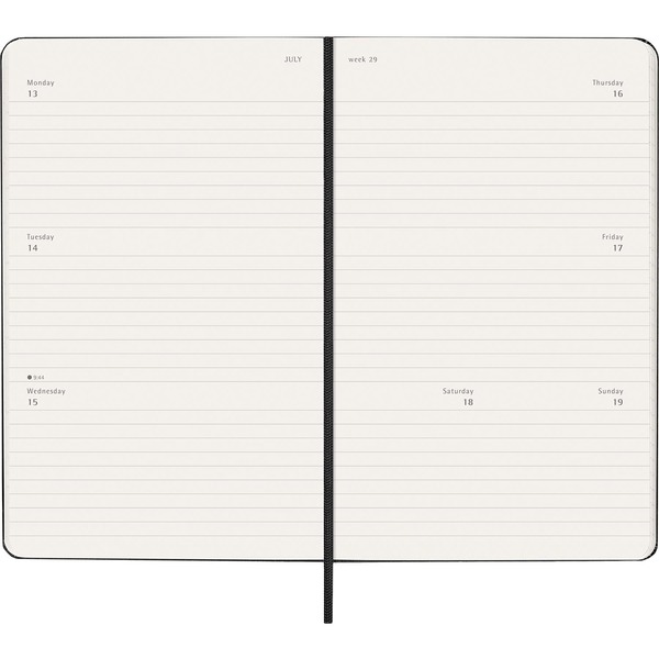Esta agenda semanal apaisada de Moleskine abarca de enero a diciembre. Su formato apaisado permite mostrar cada semana en un desplegable a doble página (lunes, martes y miércoles a la izquierda; y jueves, viernes y sábado/domingo a la derecha), por lo que resulta perfecta para conocer de un vistazo las actividades de toda la semana.