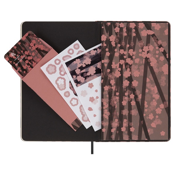 Mira en el interior para encontrar un conjunto de adhesivos temáticos, así como una tarjeta de felicitación de Sakura, ambos con las ilustraciones de Kosuke Tsumura. El cuaderno tiene páginas lisas de color marfil de 100 g/m², esquinas redondeadas, cierre elástico, cinta marcapáginas y un mensaje «en caso de pérdida» personalizable impreso en la página inicial.