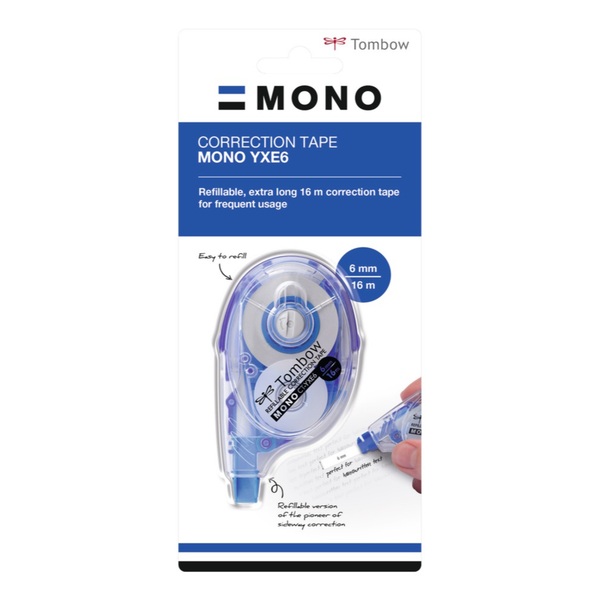Cinta correctora recargable con cinta extralarga de 16 m. Correción cómoda y precisa gracias al diseño ergonómico y la aplicación lateral. Cinta PET resistente al desgarro, aplicable hasta el última milímetro. "EASY WRITE TAPE". Sin tiempos de secado, permite escribir encima inmediatamente y con gran pulcritud gracias a la tecnología "TOMBOW COATING TECNOLOGY". Proporción de material reciclado en el peso total: 74%