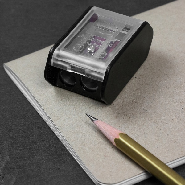 Para puntas de lápiz extra largas, forma la madera y luego la mina, el freno automático evita el sobreafilado, incluye dos cuchillas de repuesto.