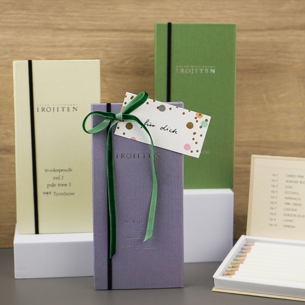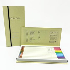 Elegante set en formato libro con una selección de colores de lápices Irojiten. Lápices de colores premium de madera de alta calidad elaborados a mano, finamente terminados con elegante laqueado blanco crema.