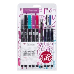 Set que contiene todo el material necesario para el hand lettering avanzado. Incluye manual de instrucciones recomendaciones y trucos para mezclar colores. Productos incluidos: 4 rotuladores ABT Dual Brush con punta flexible ancha para letras grandes y punta fina para detalles. Colores: negro (ABT-N15), deep margenta (ABT-685), cherry (ABT-815), y sea blue (ABT-373). Blender Pen incoloro (ABT-N00) para suavizar y mezclar colores. Lápiz de grafito de alta calidad MONO 100 a prueba de borrones. Grado de dureza 3H (muy duro). Rotulador de caligrafía Fudenosuke en dos versiones: punta fina pincel firme - grado de dureza 1 (duro) y punta fina pincel blanda flexible - grado de dureza 2. Tinta color negro. Rotulador permanente MONO twin con doble punta: fina y ancha. Tinta color negro. Goma de borrar MONO XS para un borrado limpio y exacto