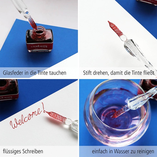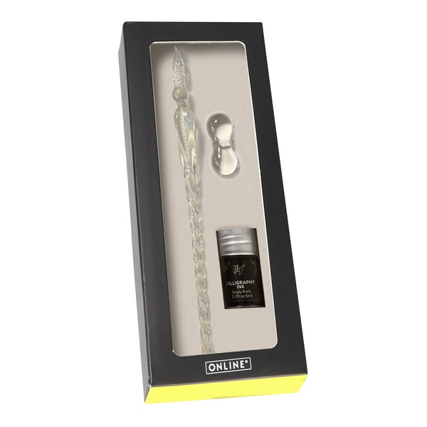 El conjunto contiene: Pluma de inmersión de vidrio : diseñada delicadamente para una experiencia de escritura única Tinta negra de 5 ml : para letras expresivas Bandeja de vidrio para bolígrafos : perfecta para un almacenamiento con estilo